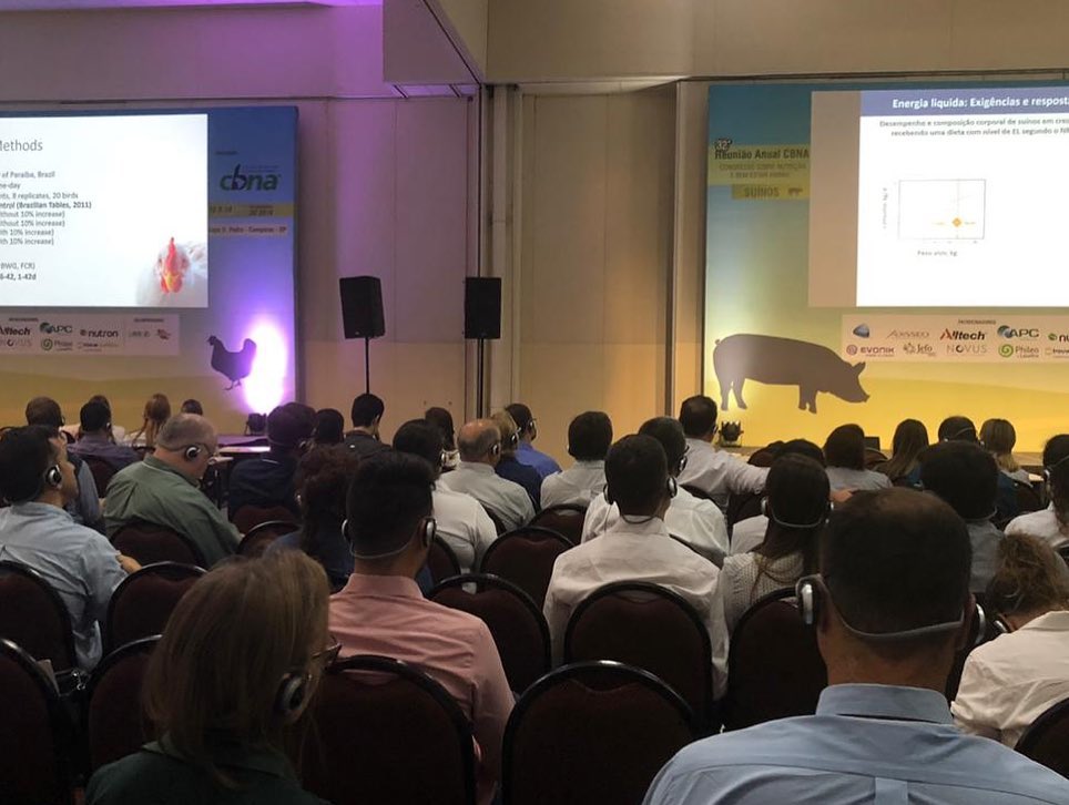 De 12 a 14 de novembro, o @eic_br esteve à frente da tradução simultânea em mais um evento de destaque na área de nutrição animal. As intérpretes @irinazablith e @tonesguizzardi realizaram o trabalho fazendo uso de toda sua experiência e formação em medicina veterinária. A segunda foto mostra a sala de aves e a de suínos funcionando simultaneamente com o sistema de sonorização silenciosa. #traducaosimultanea #simultaneoustranslation #conferenceinterpreter #agronegocio #agribusiness #nutricaoanimal #animalnutrition